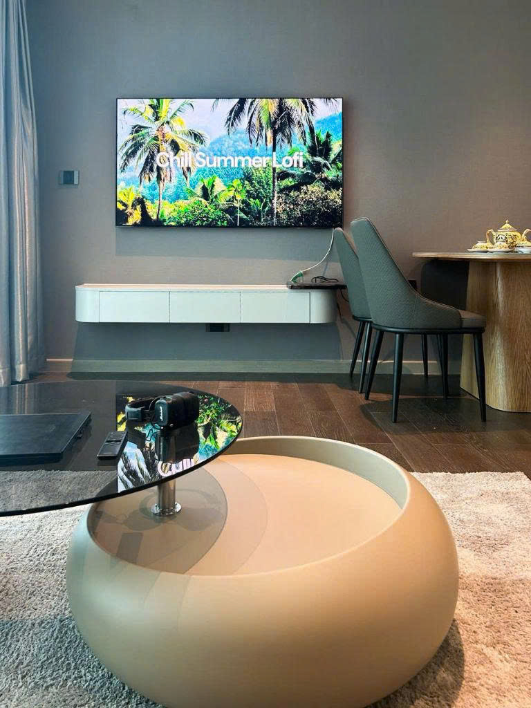 The apartment is fully furnished with high-end modern interiors, carefully selected materials, and a harmonious color palette. The open-plan living area connects seamlessly with the kitchen, creating a bright and welcoming atmosphere. The bedroom provides a calm and relaxing retreat, while the bathroom is thoughtfully designed for daily convenience and comfort.